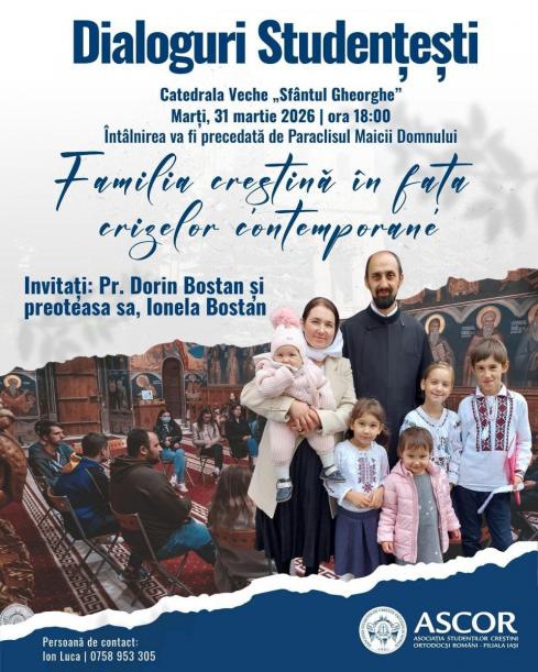 În intervalul orar 18.00-20.00, la Catedrala Veche „Sfântul Gheorghe” din Iași, va avea loc un dialog studențesc cu tema „Familia creștină în fața crizelor contemporane”. Evenimentul este organizat de Asociația Studenților Creștini Ortodocși Români – Filiala Iași și îi are ca invitați pe părintele Dorin Bostan și pe doamna preoteasă Ionela Bostan. Întâlnirea se adresează voluntarilor ASCOR Iași, studenților, precum și publicului larg.